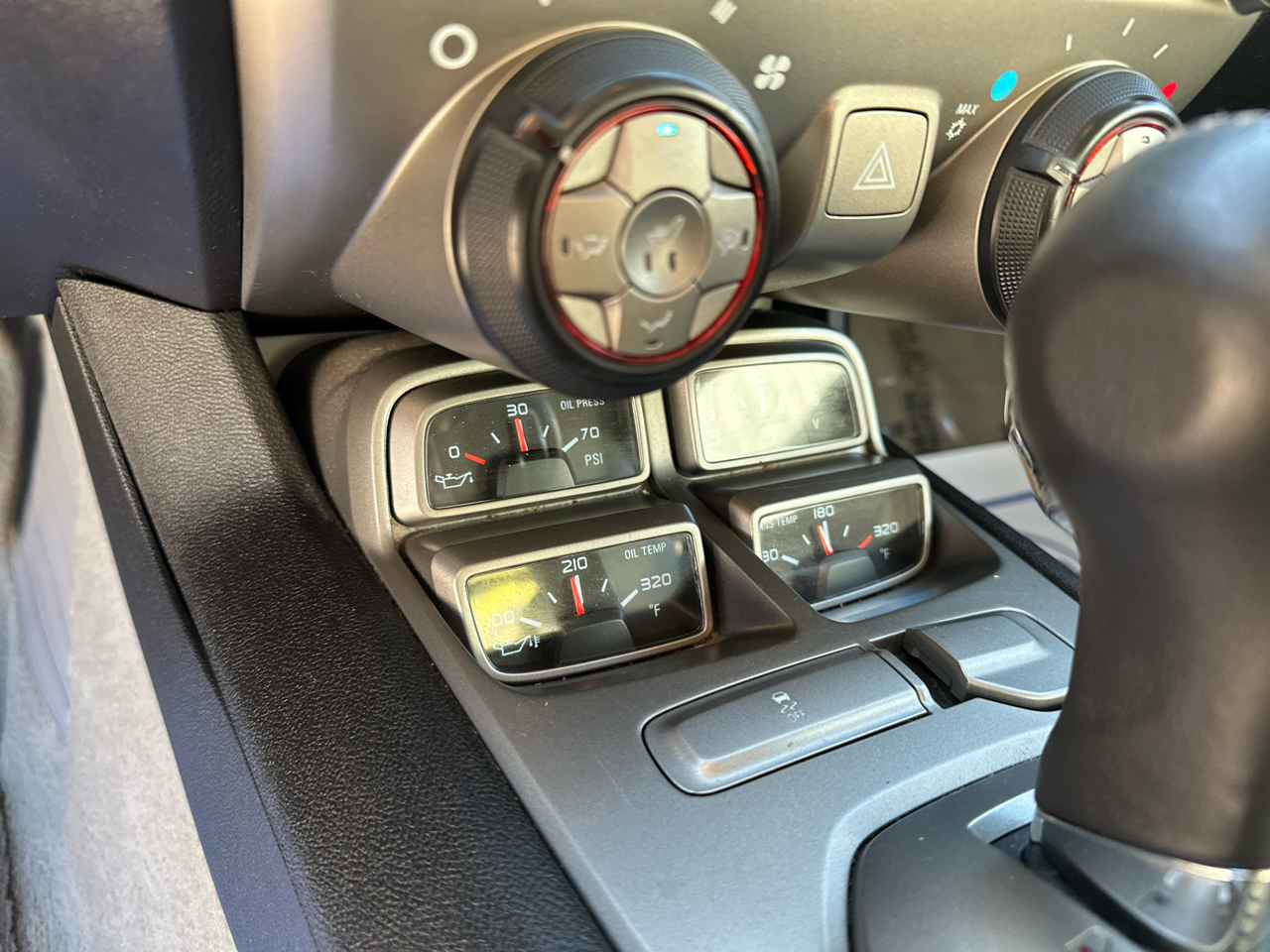 - Gauges, auxiliary, multi-function includes 4 gauges: oil pressure, battery voltage, oil temperature and transmission fluid temperature, mounted on center console forward of shifter