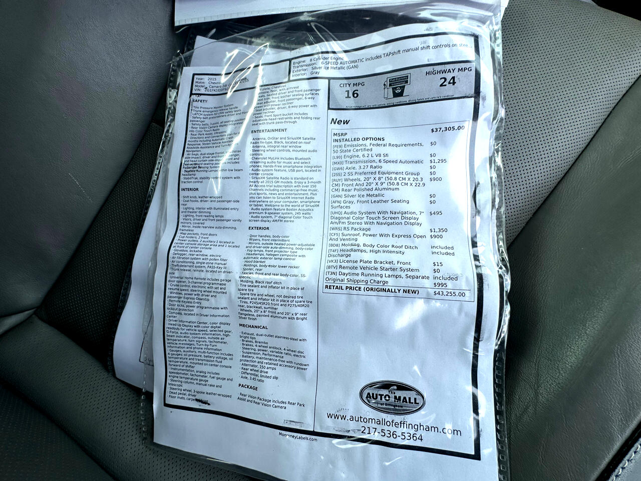 Options include but are not limited to the following: 6.2V8 engine, 6 speed automatic, 2 SS, 20" wheels, RS package, HID, remote vehicle start, coupe, rear vision camera, park assist, power window/lock/mirror/seat, MyLink, cruise control, tilt steering, and more!