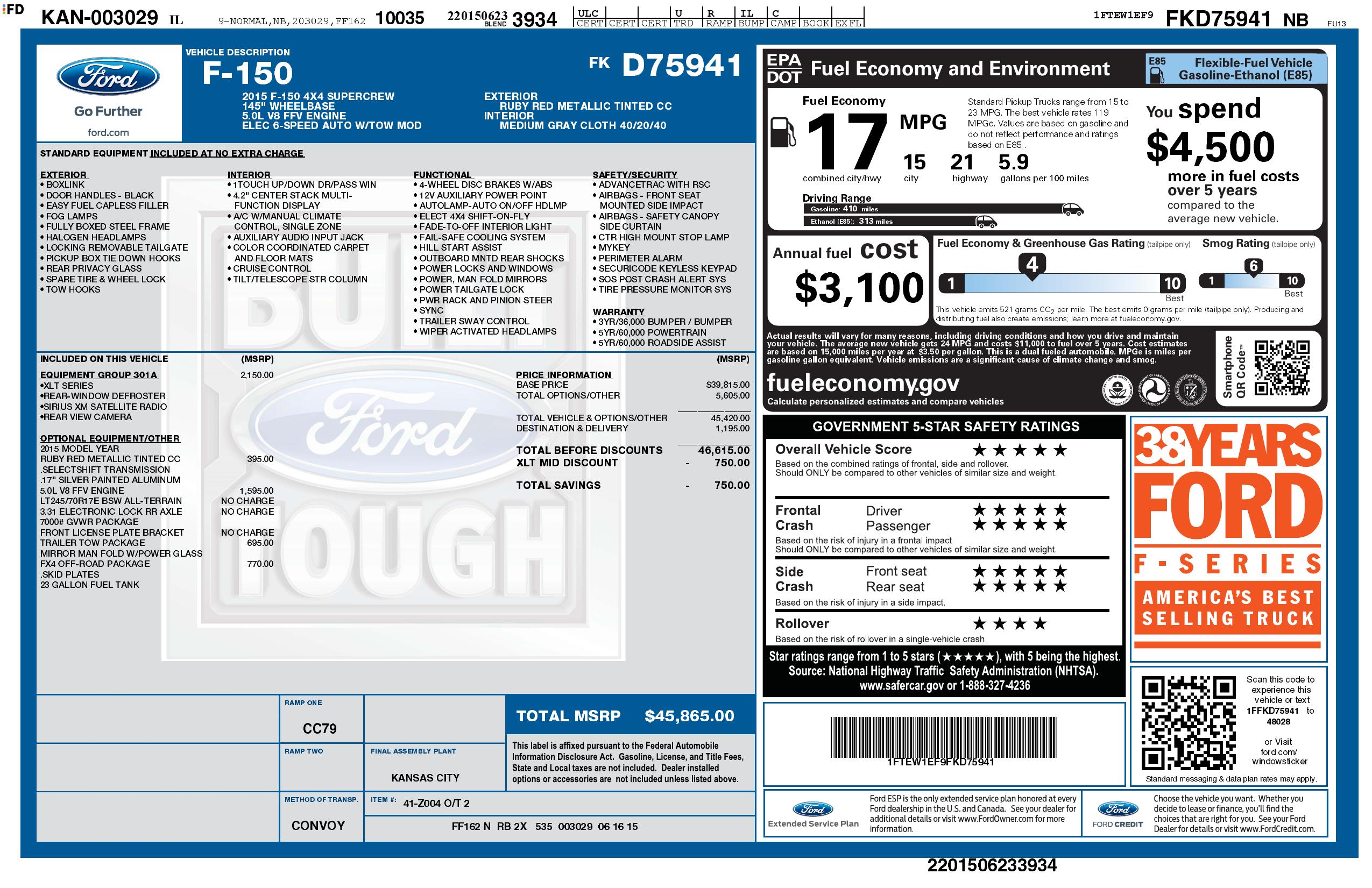 Options include but are not limited to the following: 5.0V8 engine, 6 speed automatic, XLT, 4X4, Crew cab, 17" silver painted aluminum wheels, trailer tow package, FX4 Off Road package, Skid plates, power windows/locks/mirrors, cruise control, tilt steering, a/c,rear view camera, SYNC system and more!