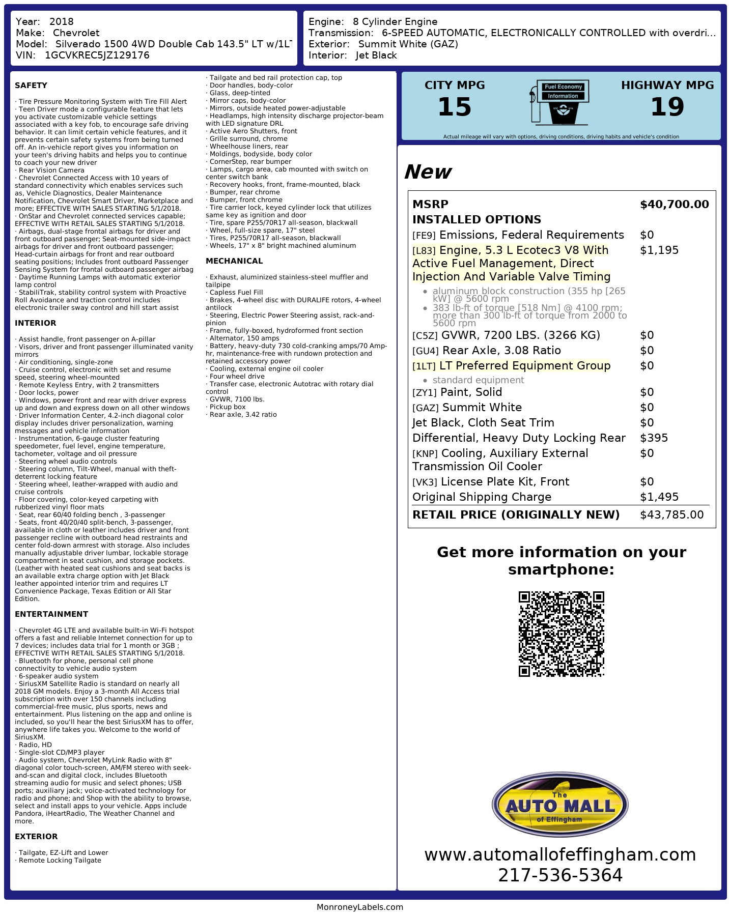Climb into this powerful and reliable 2018 Chevrolet Silverado 1500 and get ready for an adventure! This rugged white pickup truck is equipped with a rear axle ratio that can handle any terrain you throw its way, along with a pickup box ready for all your cargo needs. The four-wheel drive and electronic Autotrac transfer case give you the confidence to tackle off-road challenges with ease.